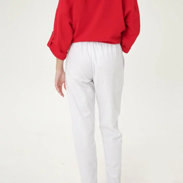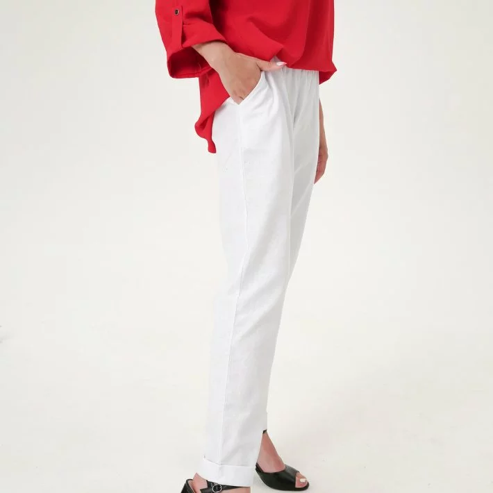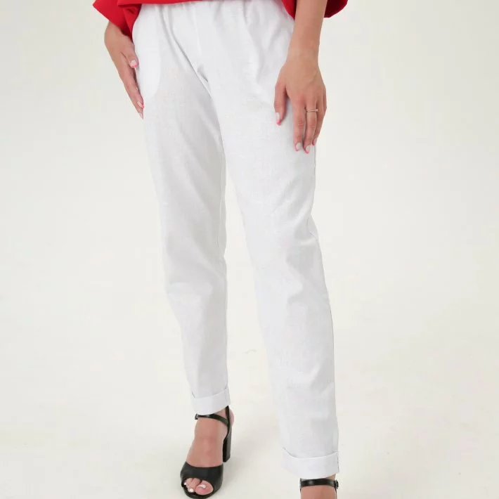 Білі класичні лляні штани, в пояс вставлена еластична гума, що