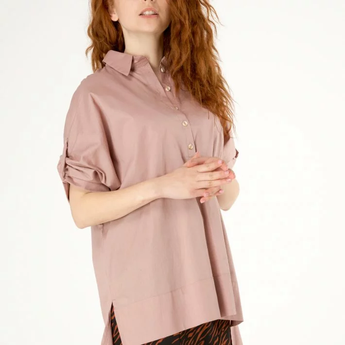 Бежева блузка вільного крою, попереду застібка на гудзик по планці,