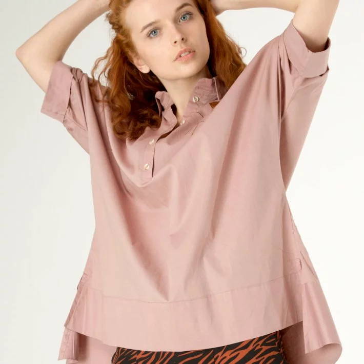 Бежева блузка вільного крою, попереду застібка на гудзик по планці,