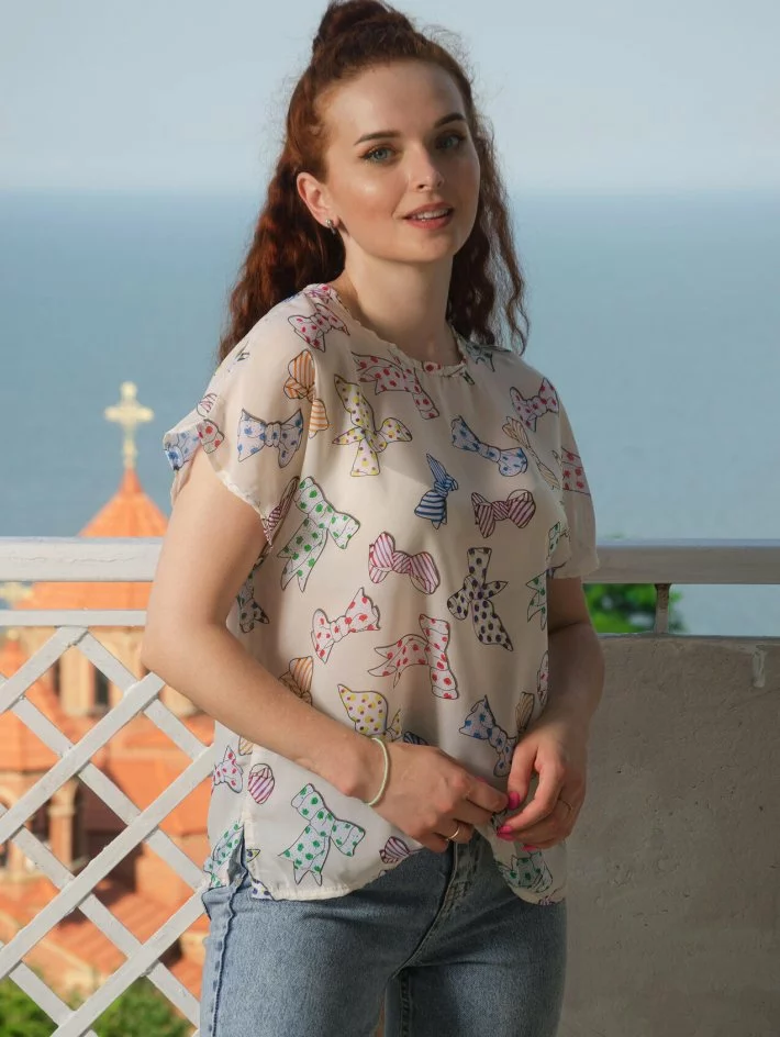 Блузка - футболка з шифону, застібка ззаду на ґудзичок.