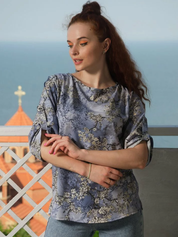 Блуза із софту з принтом, синя 230147-3, 48/50 (230147-3)