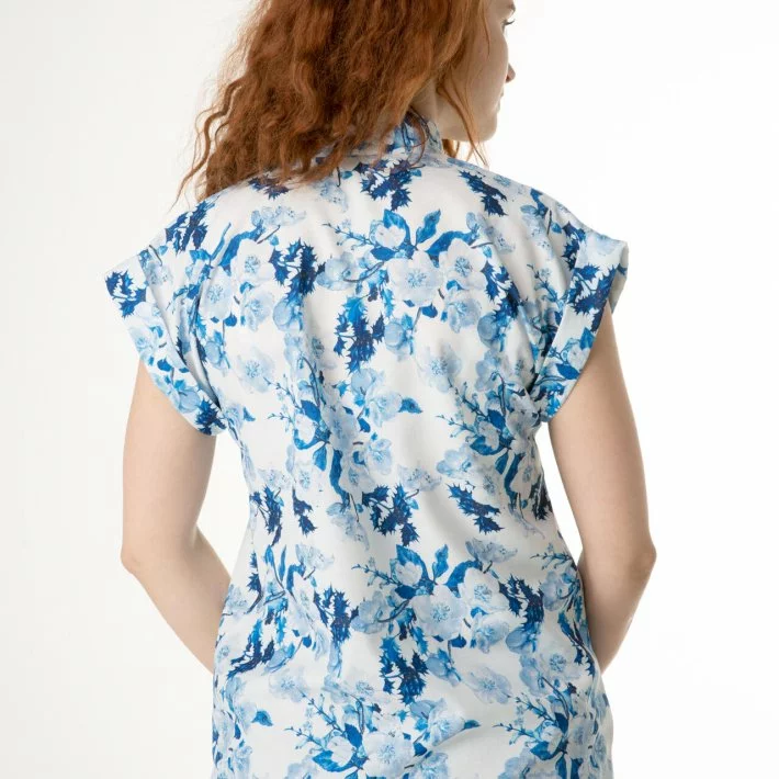 Блузка з відкритою горловиною на стійці і оригінальними манжетами