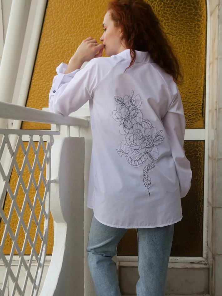 стійкою коміром. По спині вишивка велика в стилі тату на спині.