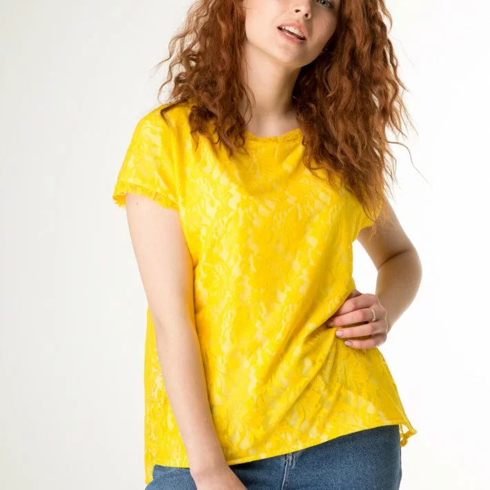 Блуза виконана з легкого мережива модних кольорів. Попереду, для