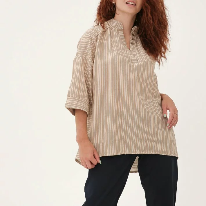 Бежева Лляна блуза в дрібну смужку 230181-2, 64/66 (230181-2)