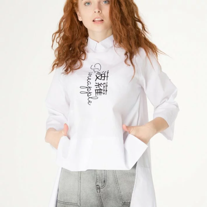 Біла сорочка з дизайнерської вишивкою, вільна, з відкладним коміром