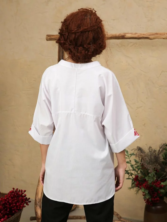 Блузка туніка прямого силуету має оригінальний крій горловини, низ