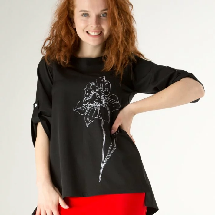Оригінального крою блузка, попереду вишивка, позаду функціональна
