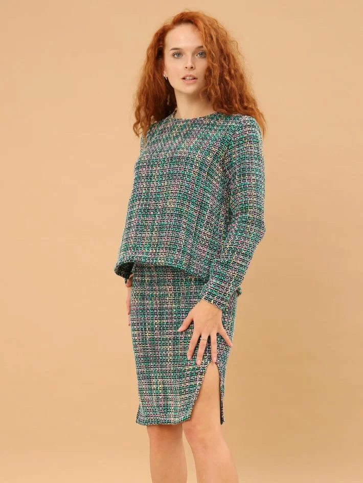 горловиною і довгим рукавом та спідниця-олівець з розрізами з