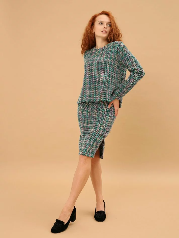 горловиною і довгим рукавом та спідниця-олівець з розрізами з
