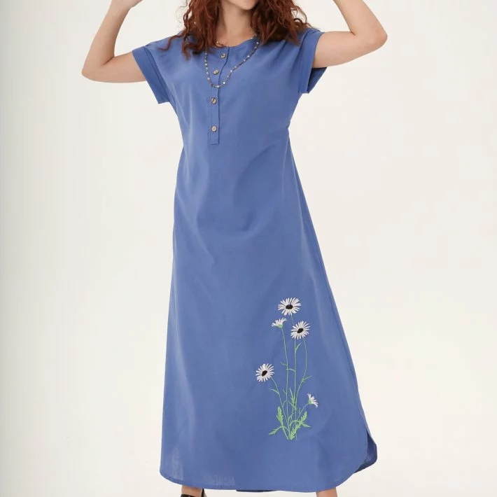Синя довга сукня із льону "Ромашки" 270184-1, 64/66 (270184-3s6466)