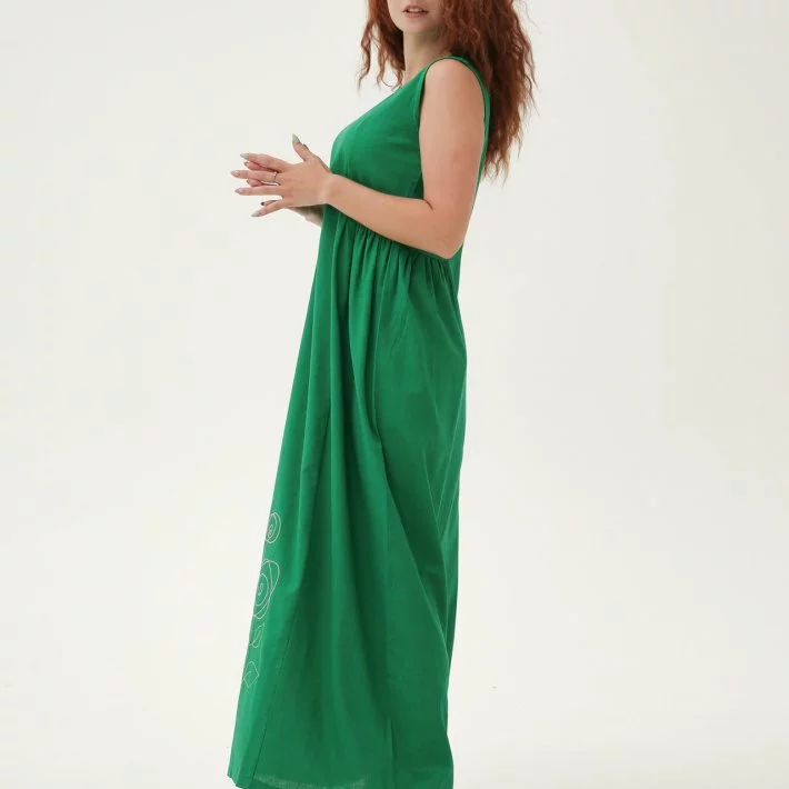 Довга сукня зі збіркою по талії з обох боків. Попереду велика