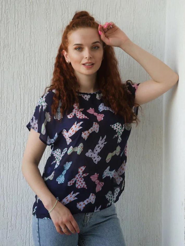 Блузка - футболка з шифону, застібка ззаду на ґудзичок.
