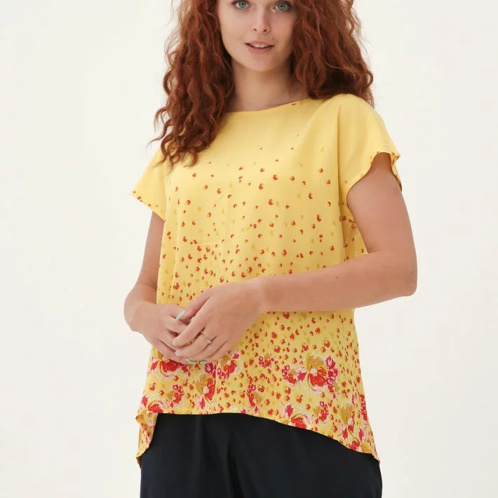 Легка літня футболка, застібається на гудзик позаду. Тканина при