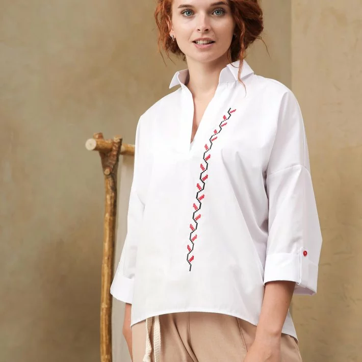 Блузка з відкритою горловиною, без застібки, прямого силуету,
