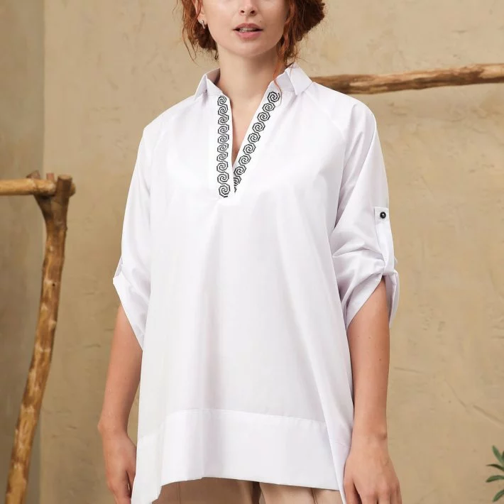 Туніка-сорочка дуже зручного крою з рукавом реглан. На горловині