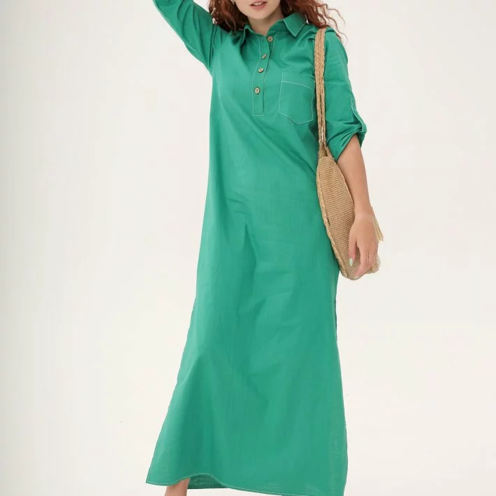 Сукня-сорочка з юбкою максі, має класичний комірець-стійку.