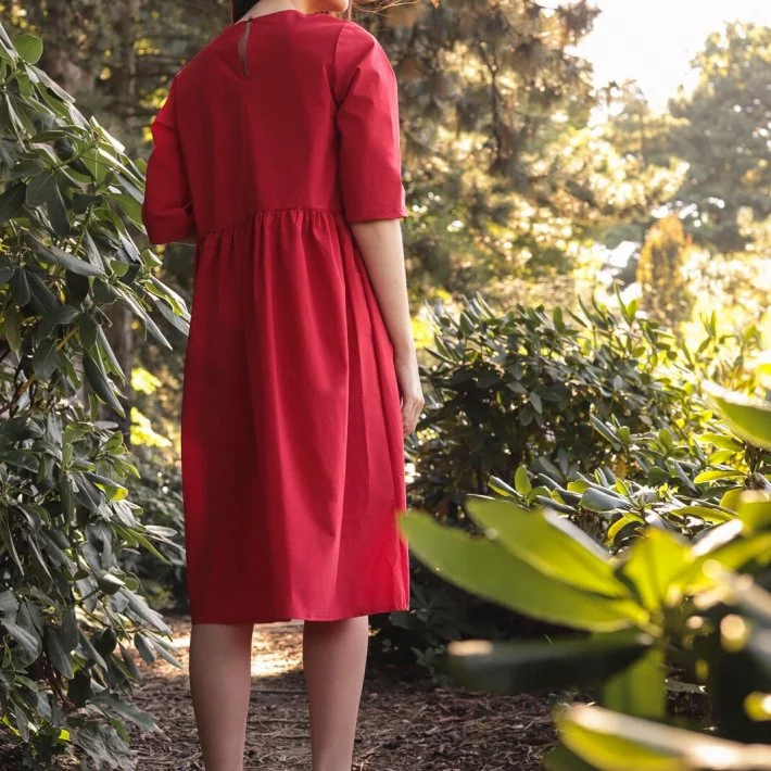 Сукня-трапеція вільного крою із збіркою по талії. При пранні
