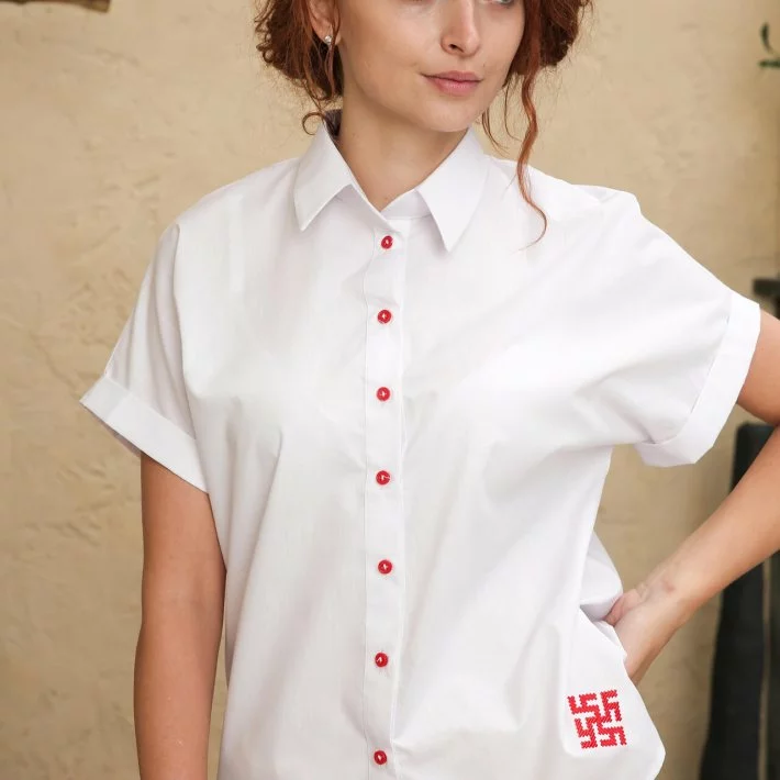 на планку на гудзики. По низу блузи Українська вишивка "Свастика"