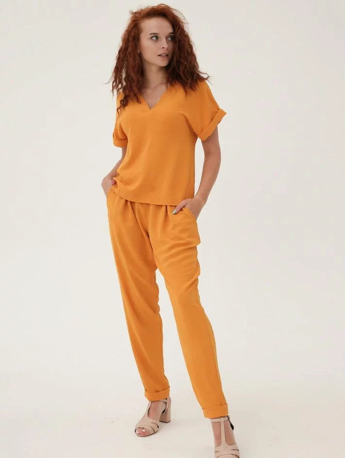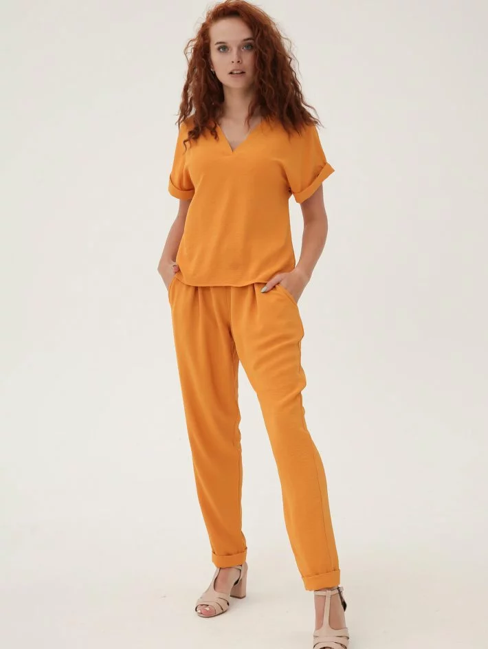 горловиною мисок, без застібки. Штани з кишенями збоку. У поясі у