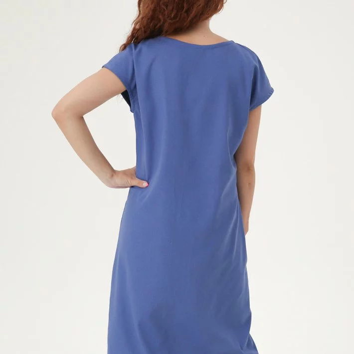 Прям синя сукня довжини трохи нижче коліна, без рукава зі спущеною
