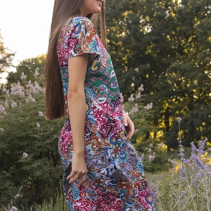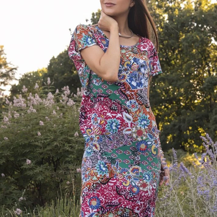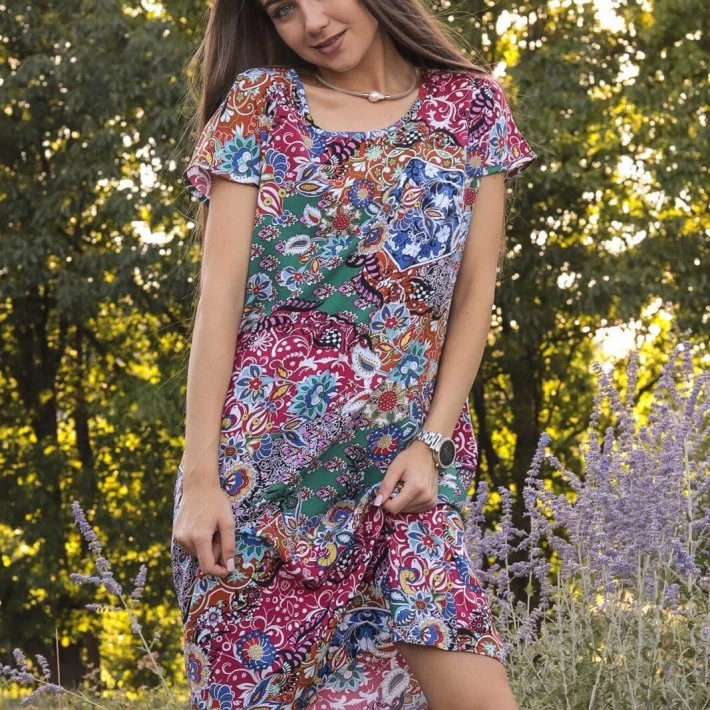 Сукня-футболка прямого крою, виконана з бавовняного штапеля. При