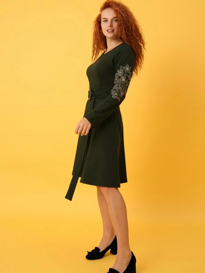 Приталена сукня з в'яленої вовни з круглою горловиною і вишивкою на