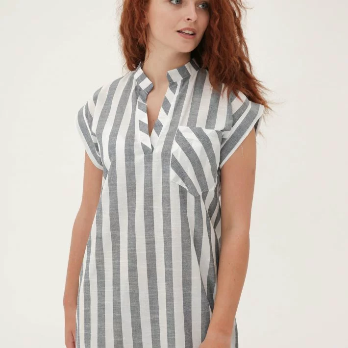 Пряма сукня з легкого смугастого льону, з коміром-стійкою і