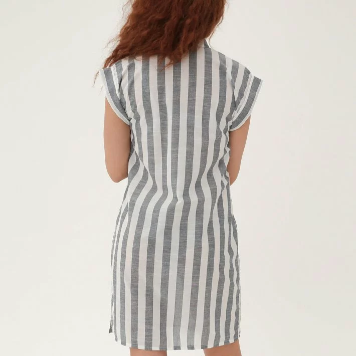 Пряма сукня з легкого смугастого льону, з коміром-стійкою і