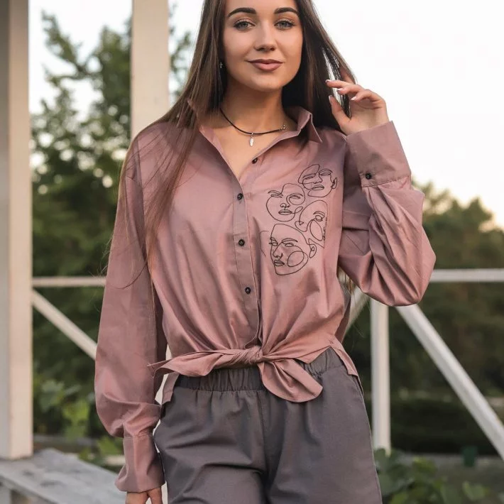 Класична сорочка в нюдовому кольорі, оздоблена вишивкою.
