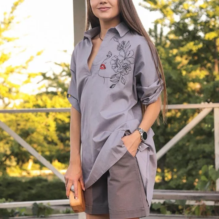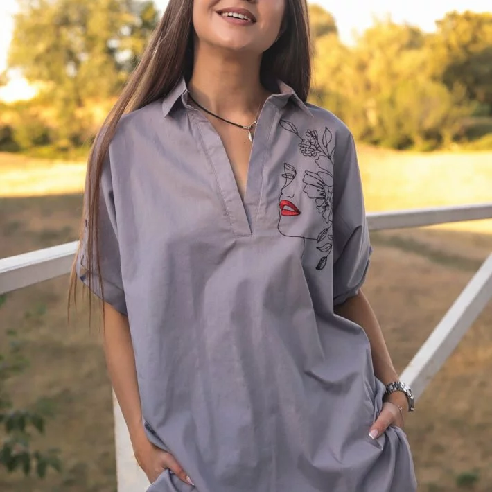Сорочка-туніка оверсайз крою, оздоблена вишивкою. При пранні не дає