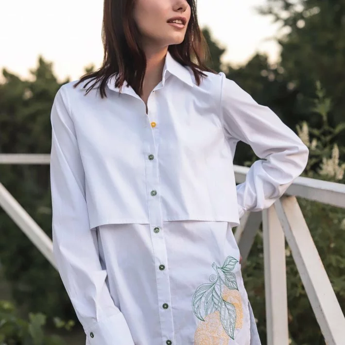 Сорочка-туніка подовженого прямого крою, повністю розстібається.