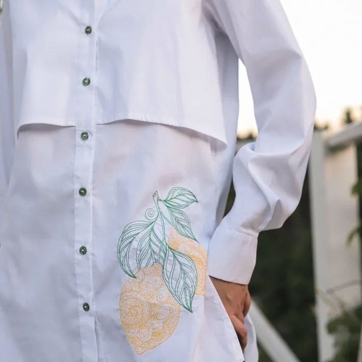 Декорована вишивкою "Лимони". Тканина при пранні не дає усадку. Ми
