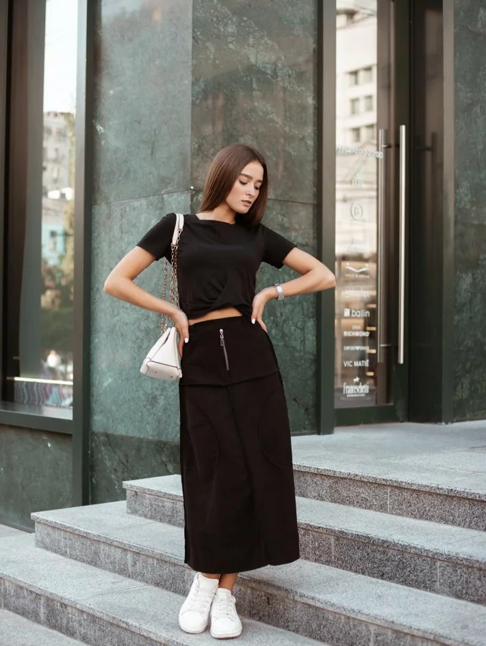 Спідниця довгої міді з відкритими оригінальними швами, спереду
