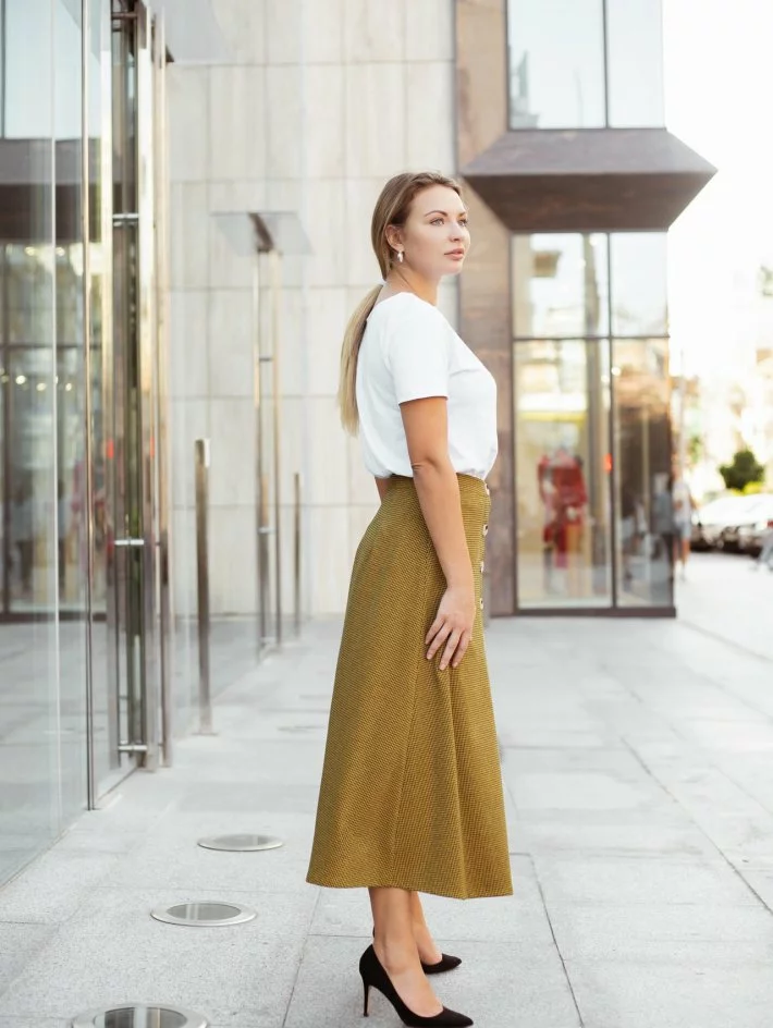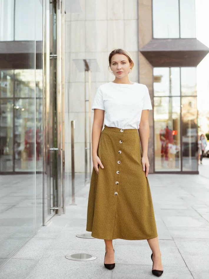Модна цього сезону Спідниця - трапеція з гарними гудзиками спереду,