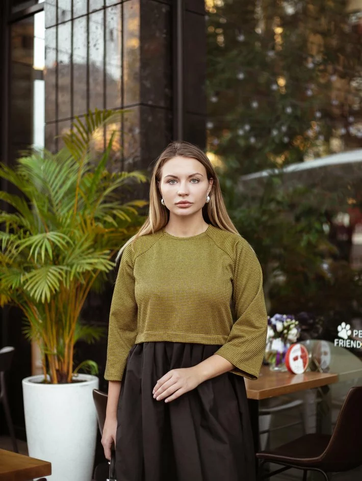 спідниці передбачені бічні місткі кишені. Рукав реглан 3/4, ззаду
