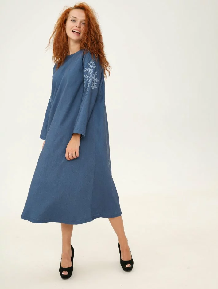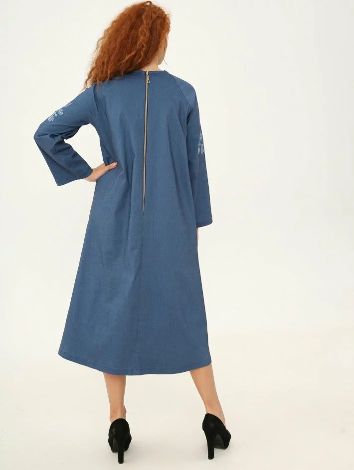 Сукня трапецієподібного крою, рукав реглан. По рукаву вишивка в тон