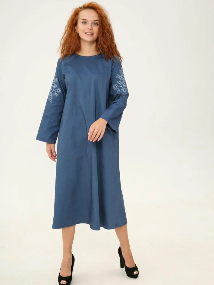 Сукня трапецієподібного крою, рукав реглан. По рукаву вишивка в тон