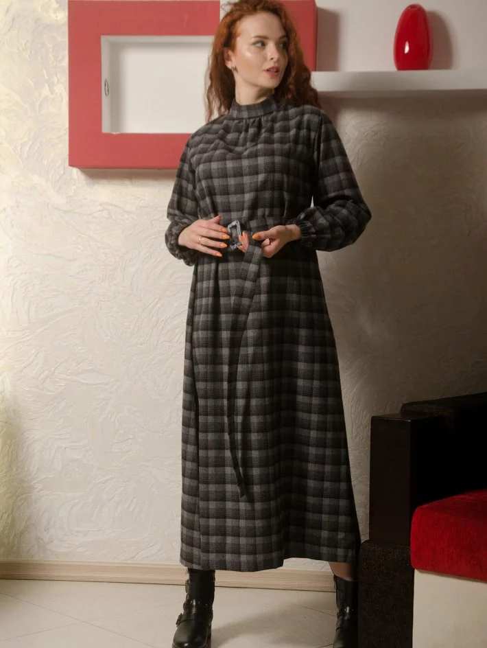 Сукня з тканини у клітку трапецеподібного крою. Рукав вільний на